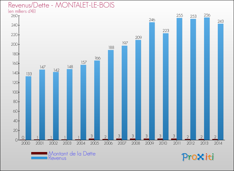 Comparaison Revenus/Dette de Montalet-le-Bois (de 2000 à 2014)