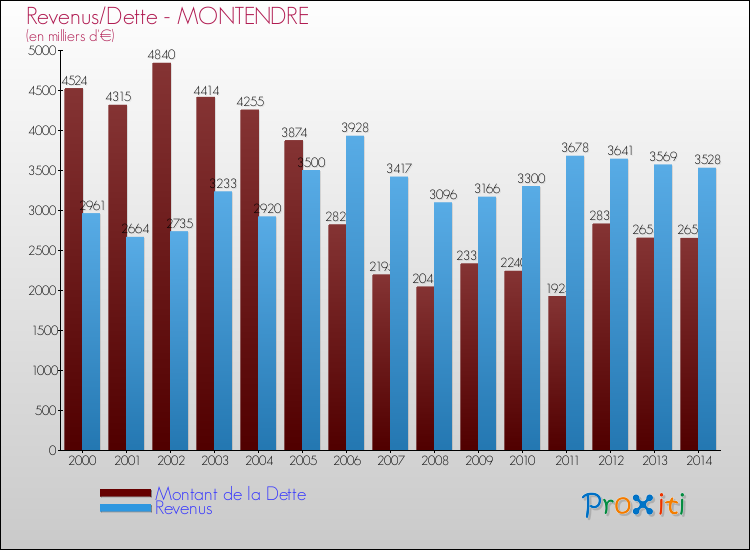 Comparaison Revenus/Dette de Montendre (de 2000 à 2014)