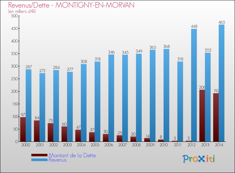 Comparaison Revenus/Dette de Montigny-en-Morvan (de 2000 à 2014)