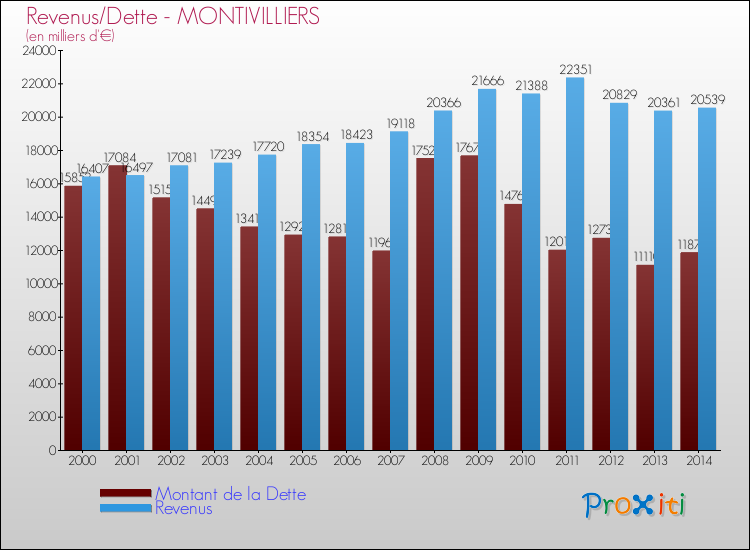Comparaison Revenus/Dette de Montivilliers (de 2000 à 2014)