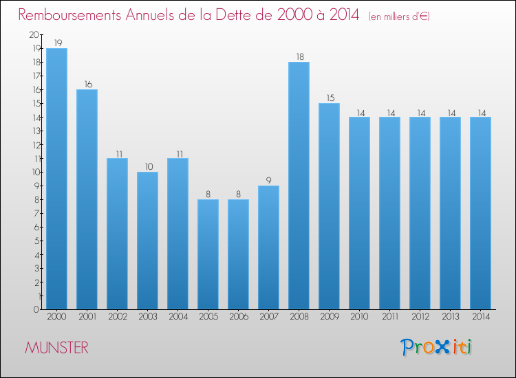 Par rapport aux 223 habitants de Munster, en 2014 le poids de cette dette représente 416 € par habitant.