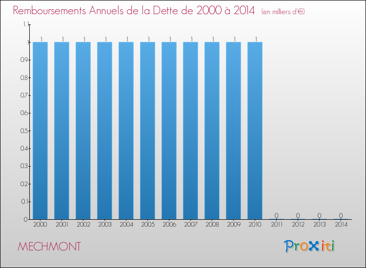 Par rapport aux 119 habitants de Mechmont, en 2014 le poids de cette dette représente 8 € par habitant.