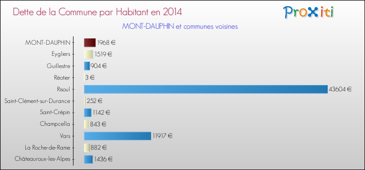 Par rapport aux 154 habitants de Mont-Dauphin, en 2014 le poids de cette dette représente 1968 € par habitant.