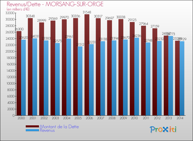 Comparaison Revenus/Dette de Morsang-sur-Orge (de 2000 à 2014)