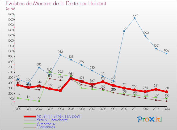 A Noyelles-en-Chaussée, la dette par habitant a donc baissé de 36.19 % entre 2000 et 2014.