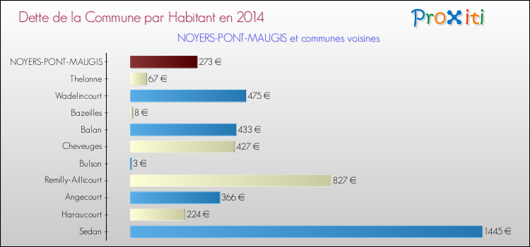 A Noyers-Pont-Maugis, la dette due par habitant de la commune en 2014 est donc moins élevée de 54.19 % que pour des communes similaires.