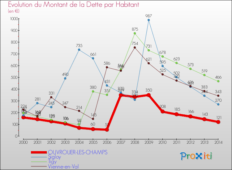 A Ouvrouer-les-Champs, la dette par habitant a donc baissé de 23.42 % entre 2000 et 2014.