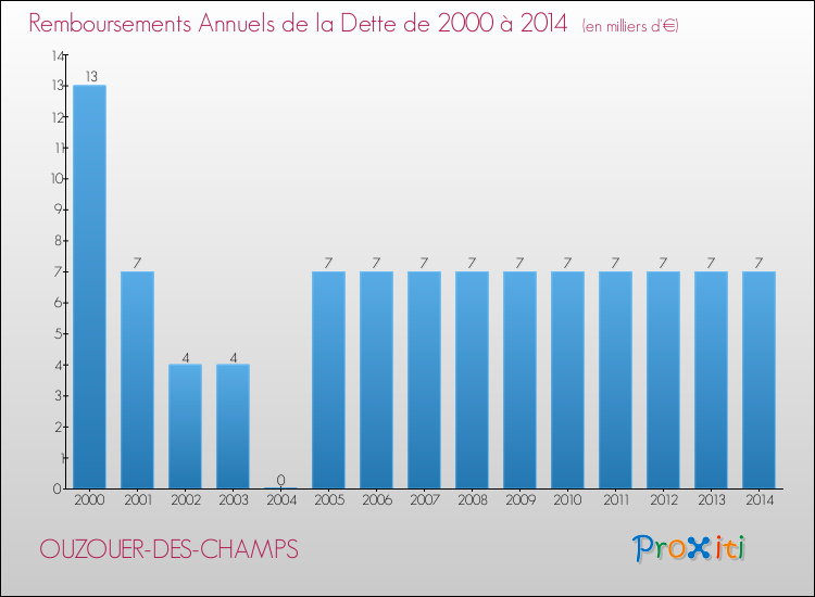 A Ouzouer-des-Champs, ce montant de la dette est pourtant en baisse de 13.89 % par rapport à 2013.