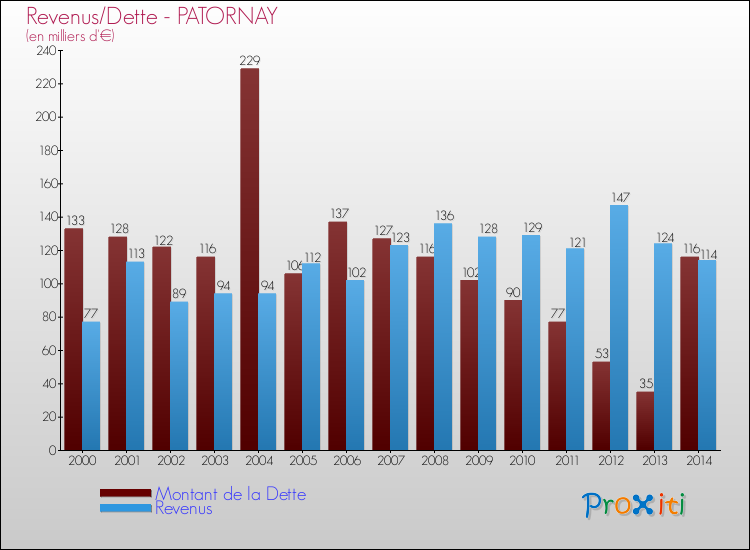 Comparaison Revenus/Dette de Patornay (de 2000 à 2014)