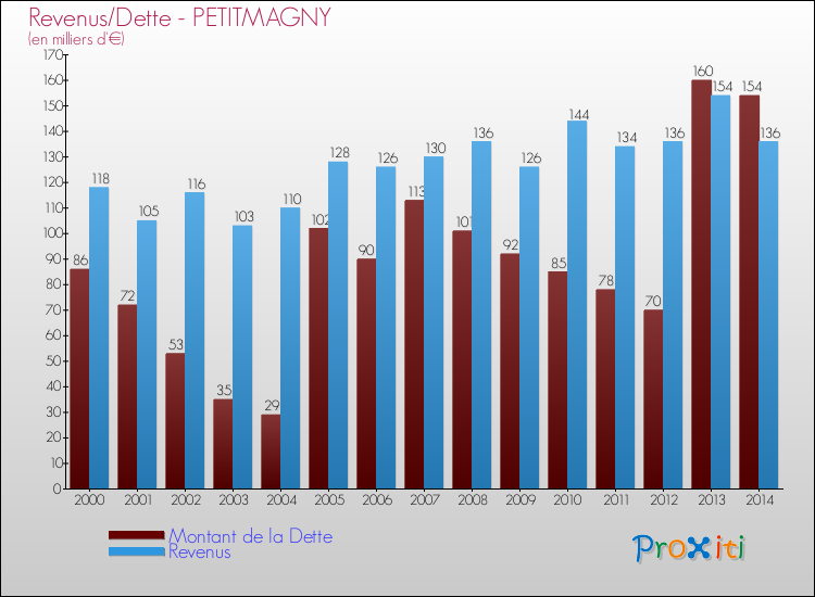 Comparaison Revenus/Dette de Petitmagny (de 2000 à 2014)