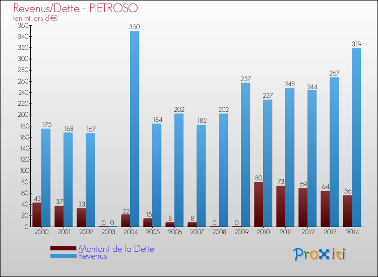 Comparaison Revenus/Dette de Pietroso (de 2000 à 2014)