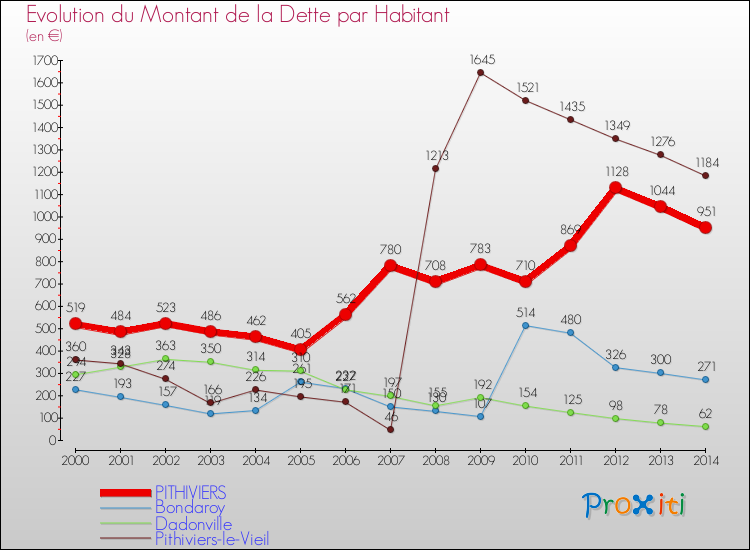 A Pithiviers, la dette par habitant a donc augmenté de 83.24 % entre 2000 et 2014.
