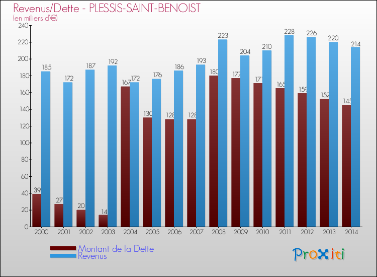 Comparaison Revenus/Dette de Plessis-Saint-Benoist (de 2000 à 2014)