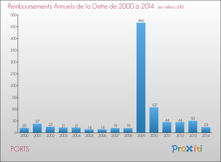 A Ports, la dette due par habitant de la commune en 2014 est donc plus élevée de 134.64 % que pour des communes similaires.