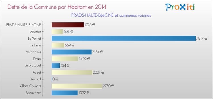 A Prads-Haute-Bléone, la dette due par habitant de la commune en 2014 est donc plus élevée de 229.2 % que pour des communes similaires.