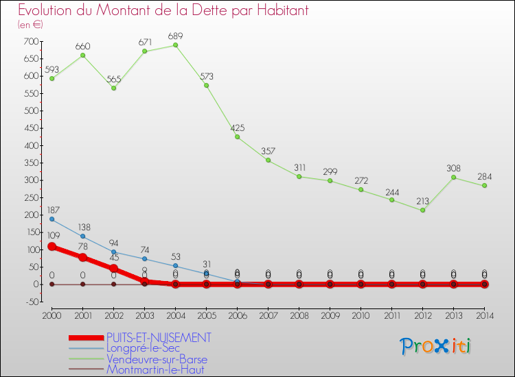 Pendant la même période, les communes françaises similaires à Puits-et-Nuisement, ont vu leur dette par habitant augmenter de 28.75 % en moyenne entre 2000 et 2014.