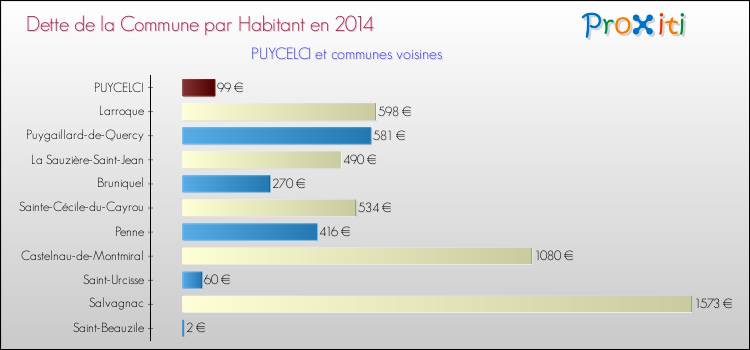 Par rapport aux 494 habitants de Puycelci, en 2014 le poids de cette dette représente 99 € par habitant.