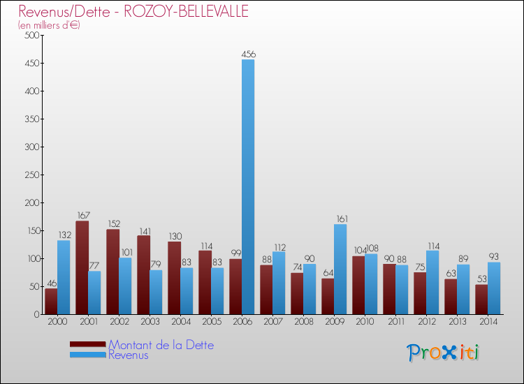 Comparaison Revenus/Dette de Rozoy-Bellevalle (de 2000 à 2014)