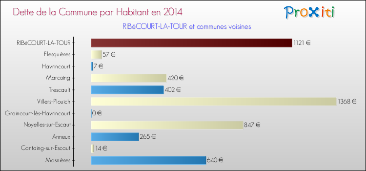 A Ribécourt-la-Tour, la dette due par habitant de la commune en 2014 est donc plus élevée de 131.13 % que pour des communes similaires.