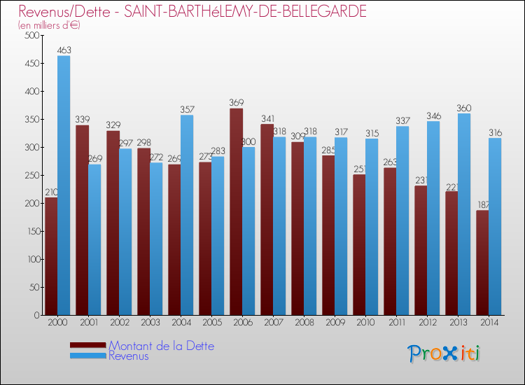 Comparaison Revenus/Dette de Saint-Barthélemy-de-Bellegarde (de 2000 à 2014)