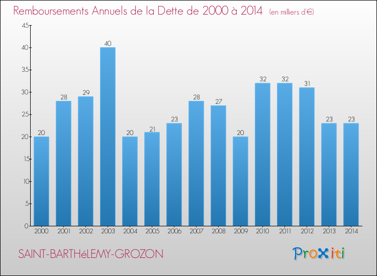 Le graphique ci-dessous représente l'évolution de la dette par habitant à Saint-Barthélemy-Grozon depuis 2000.