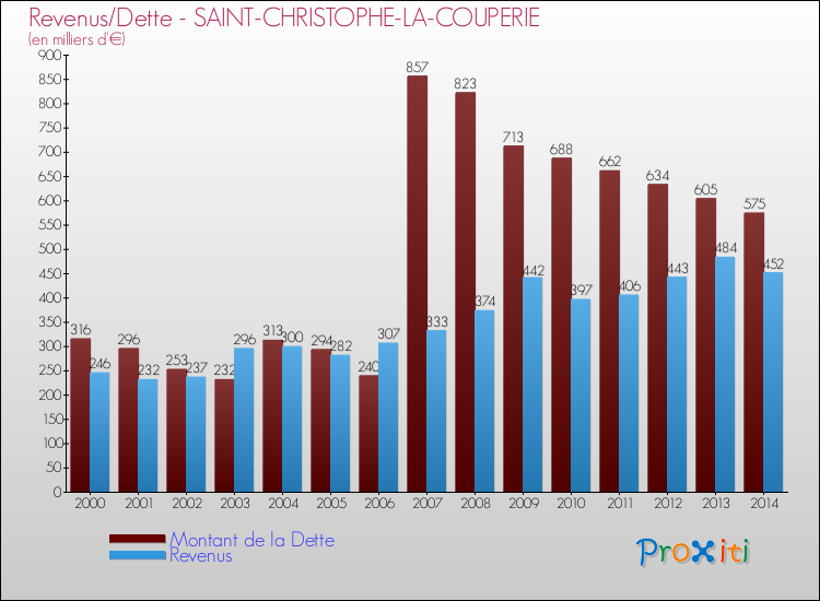 Comparaison Revenus/Dette de Saint-Christophe-la-Couperie (de 2000 à 2014)