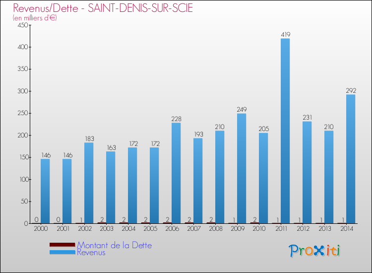 Comparaison Revenus/Dette de Saint-Denis-sur-Scie (de 2000 à 2014)