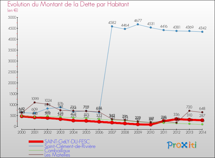 Pendant la même période, les communes françaises similaires à Saint-Gély-du-Fesc, ont vu leur dette par habitant baisser de 6.85 % en moyenne entre 2000 et 2014.