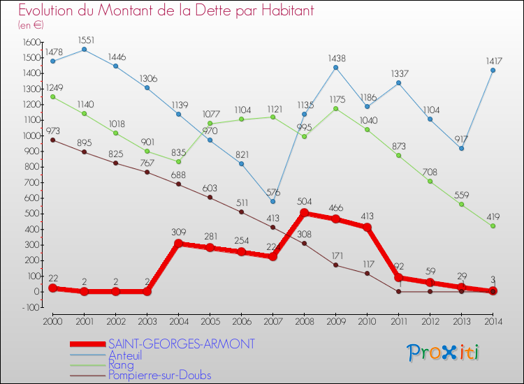 Pendant la même période, les communes françaises similaires à Saint-Georges-Armont, ont vu leur dette par habitant augmenter de 28.75 % en moyenne entre 2000 et 2014.