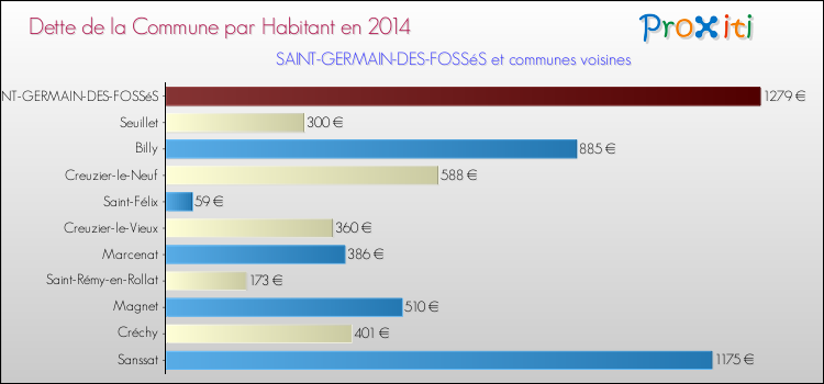 A Saint-Germain-des-Fossés, la dette due par habitant de la commune en 2014 est donc plus élevée de 61.08 % que pour des communes similaires.