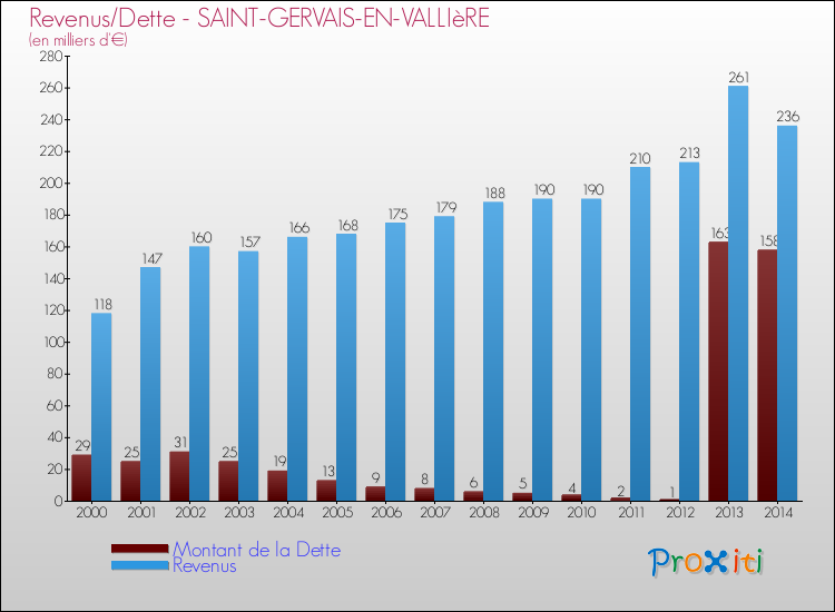 Comparaison Revenus/Dette de Saint-Gervais-en-Vallière (de 2000 à 2014)