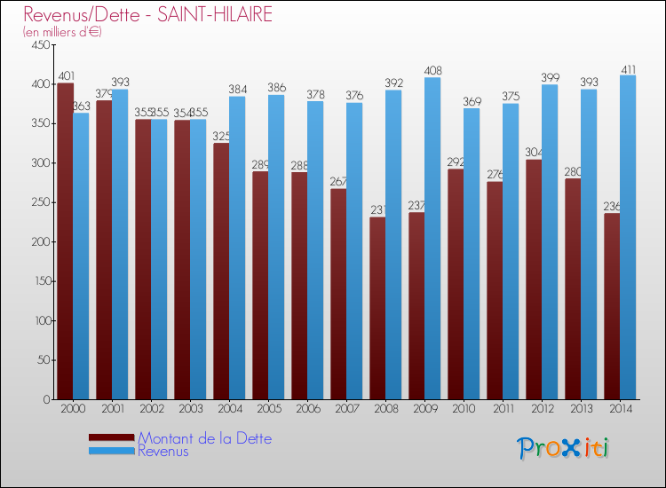 Comparaison Revenus/Dette de Saint-Hilaire (de 2000 à 2014)