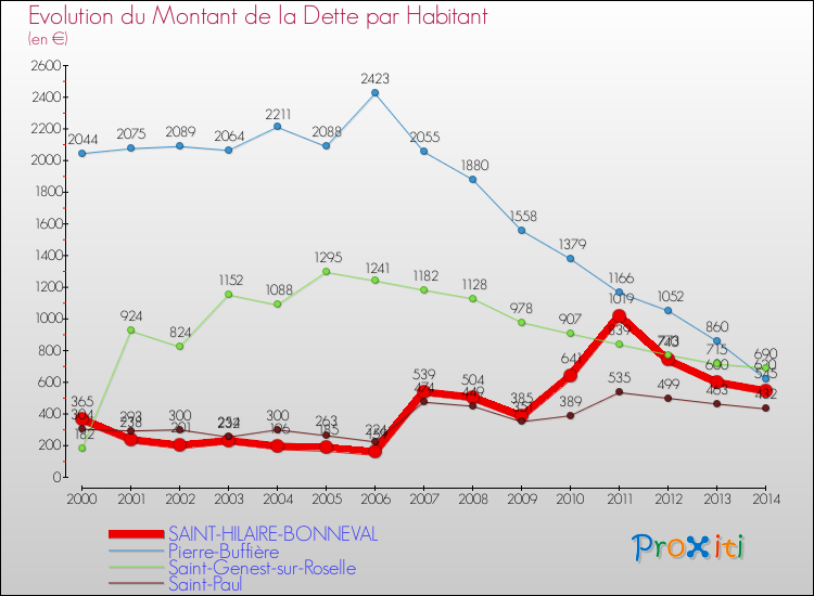 A Saint-Hilaire-Bonneval, la dette par habitant a donc augmenté de 49.32 % entre 2000 et 2014.
