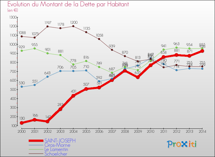 Le graphique ci-dessous représente l'évolution de la dette par habitant à Saint-Joseph depuis 2000.