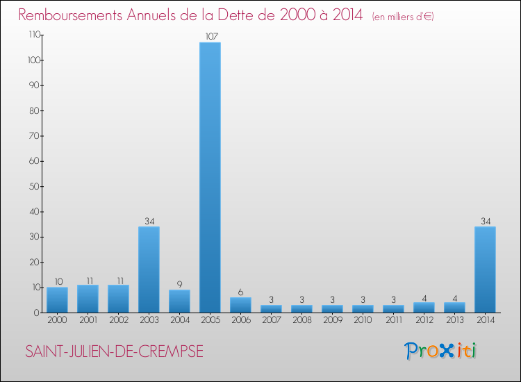 Remarque : sur cette page ne figurent pour le moment que les données concernant la dette contractée directement par la commune de Saint-Julien-de-Crempse. Les chiffres concernant la dette de la communauté de communes ou d'agglomération, qui peuvent être plus importantes que celles de la commune doivent faire l'objet d'une publication dans les prochains jours.