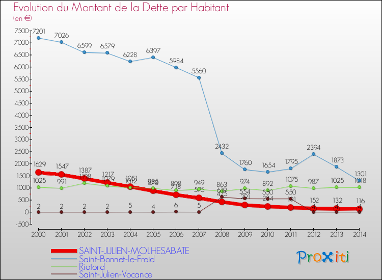 Comparaison de la dette par habitant pour SAINT-JULIEN-MOLHESABATE et les communes voisines de 2000 à 2014