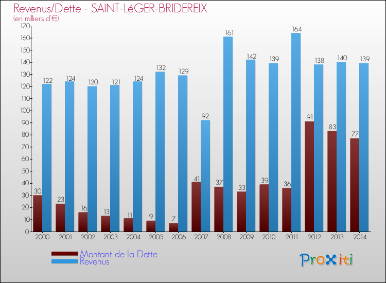 Comparaison Revenus/Dette de Saint-Léger-Bridereix (de 2000 à 2014)