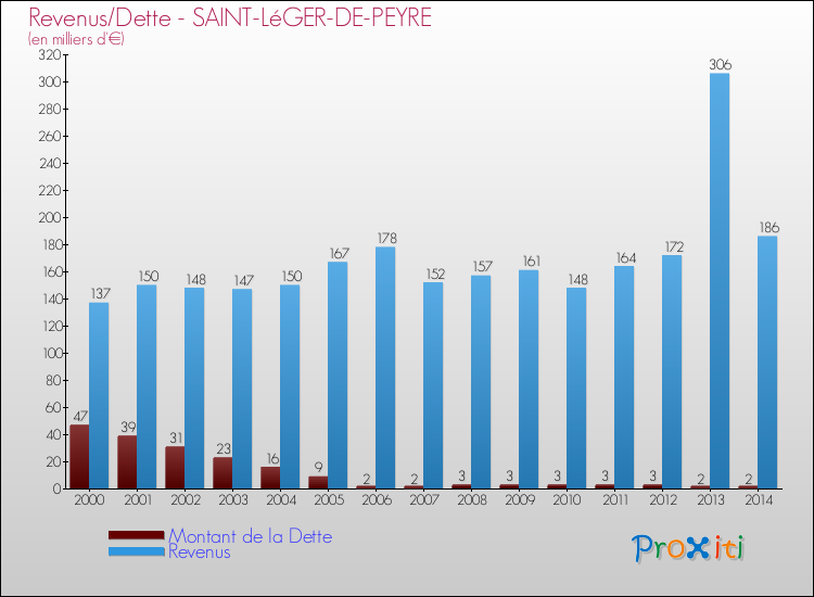 Comparaison Revenus/Dette de Saint-Léger-de-Peyre (de 2000 à 2014)