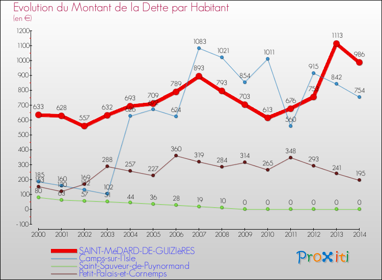 Pendant la même période, les communes françaises similaires à Saint-Médard-de-Guizières, ont vu leur dette par habitant baisser de 3.79 % en moyenne entre 2000 et 2014.