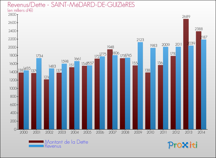 Comparaison Revenus/Dette de Saint-Médard-de-Guizières (de 2000 à 2014)