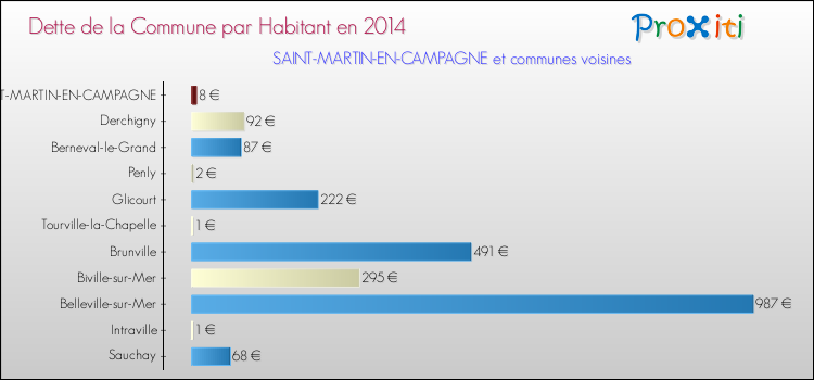 A Saint-Martin-en-Campagne, la dette due par habitant de la commune en 2014 est donc moins élevée de 98.66 % que pour des communes similaires.
