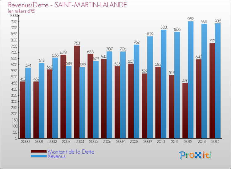Comparaison Revenus/Dette de Saint-Martin-Lalande (de 2000 à 2014)