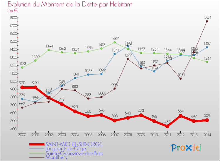 A noter : la valeur moyenne de la dette par habitant des communes françaises similaires à Saint-Michel-sur-Orge était de 1100 € par habitant, en 2014.