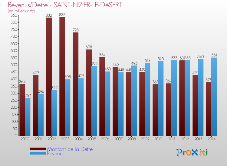 Comparaison Revenus/Dette de Saint-Nizier-le-Désert (de 2000 à 2014)