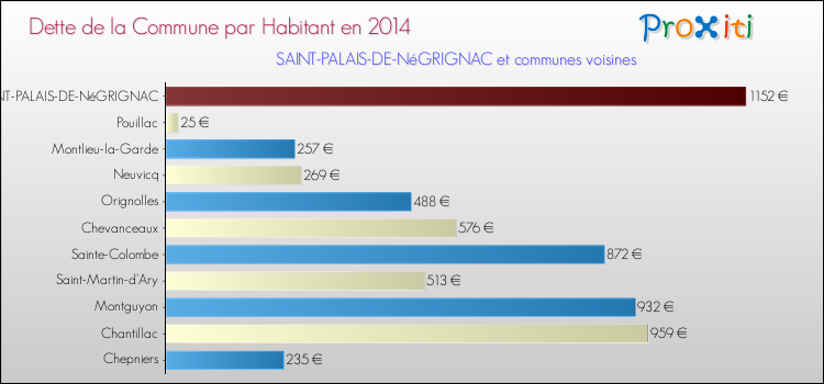 A Saint-Palais-de-Négrignac, la dette due par habitant de la commune en 2014 est donc plus élevée de 108.7 % que pour des communes similaires.