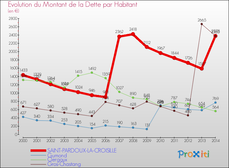 Pendant la même période, les communes françaises similaires à Saint-Pardoux-la-Croisille, ont vu leur dette par habitant augmenter de 28.75 % en moyenne entre 2000 et 2014.