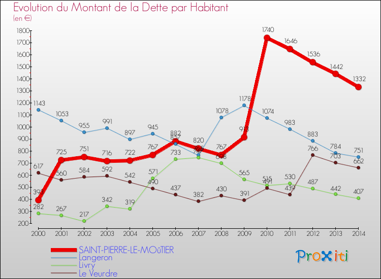 Pendant la même période, les communes françaises similaires à Saint-Pierre-le-Moûtier, ont vu leur dette par habitant augmenter de 26.71 % en moyenne entre 2000 et 2014.