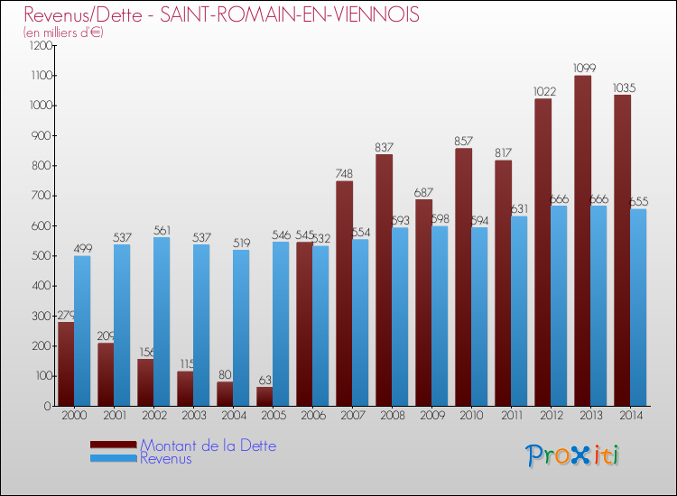Comparaison Revenus/Dette de Saint-Romain-en-Viennois (de 2000 à 2014)
