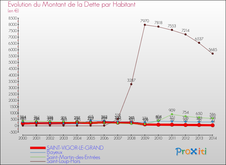 Pendant la même période, les communes françaises similaires à Saint-Vigor-le-Grand, ont vu leur dette par habitant augmenter de 37.07 % en moyenne entre 2000 et 2014.