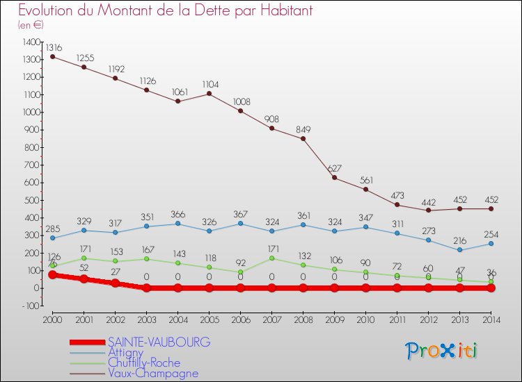 Pendant la même période, les communes françaises similaires à Sainte-Vaubourg, ont vu leur dette par habitant augmenter de 50.57 % en moyenne entre 2000 et 2014.